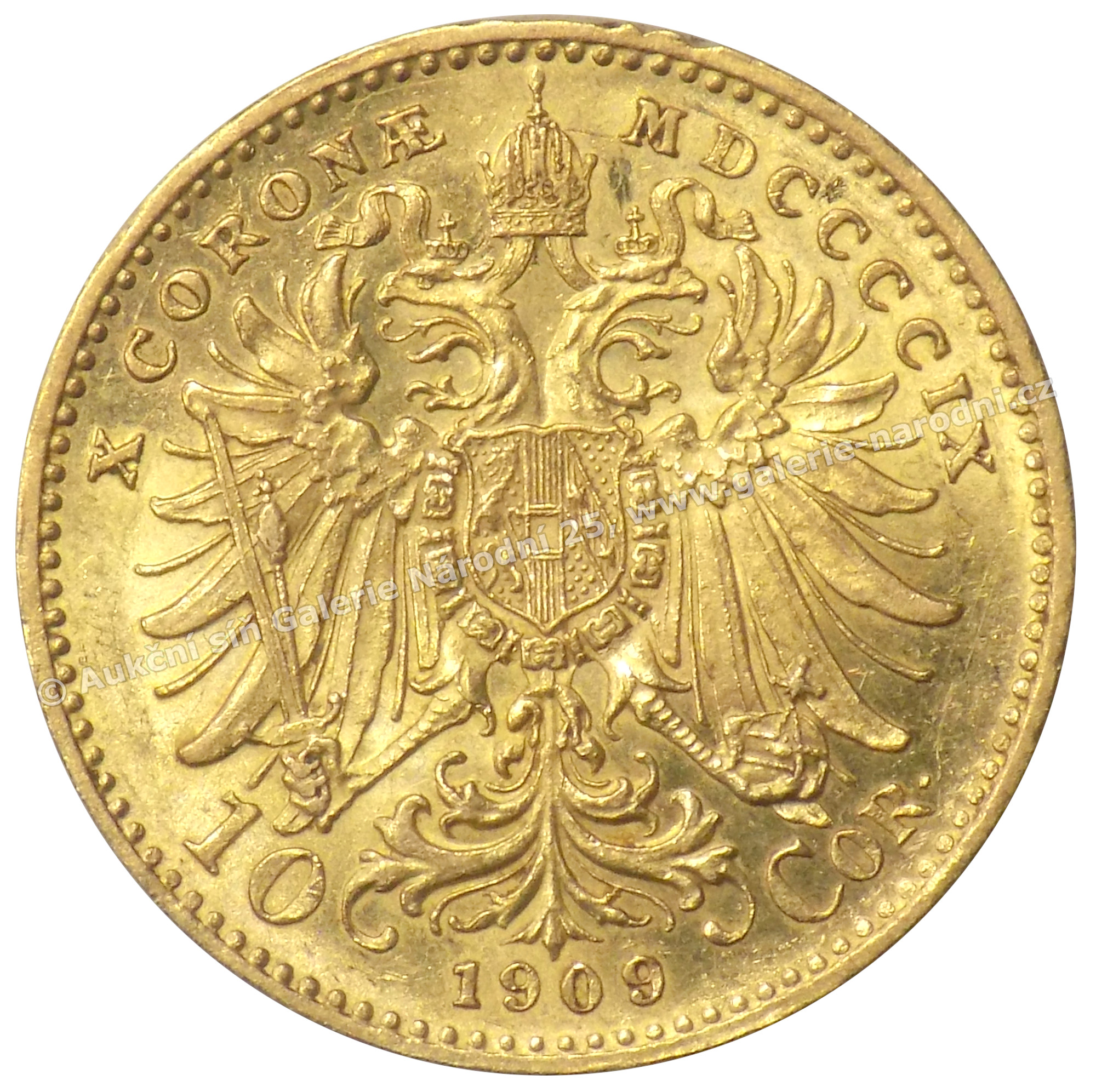 Au 900/1000, váha 3, 38 g, průměr 19 mm, rok 1909, oťuky na hraně, rysky na ploše