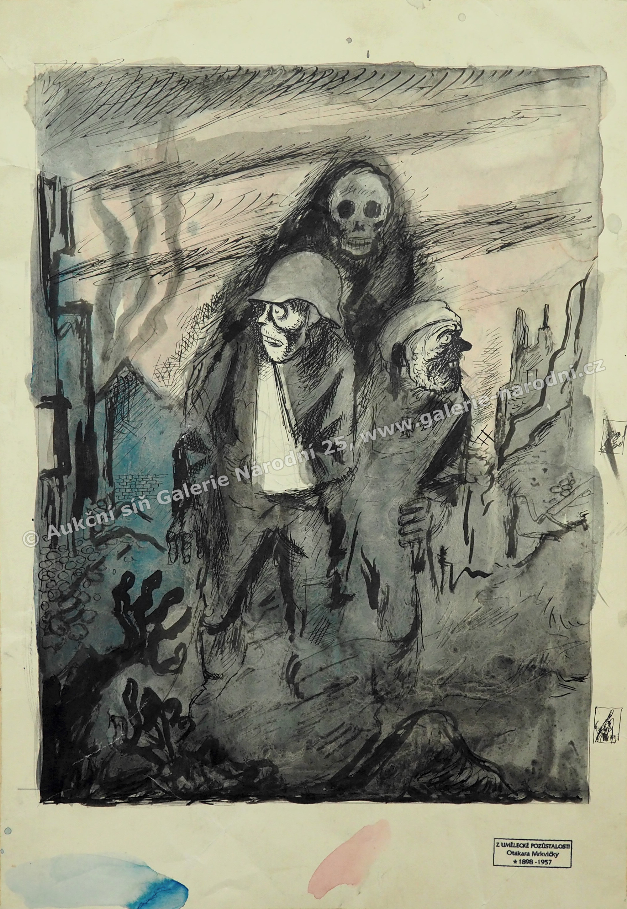 kombinovaná technika na papíře, 42 x 30 cm, volně loženo, papír silně poškozen, nesignováno, pozůstalostní razítko autora