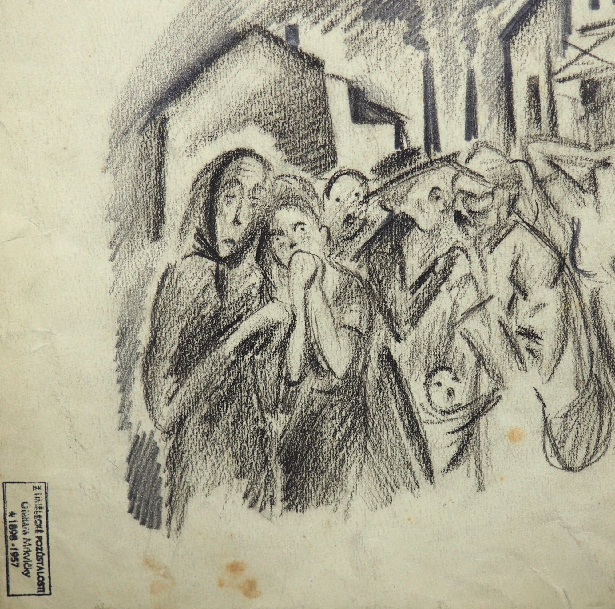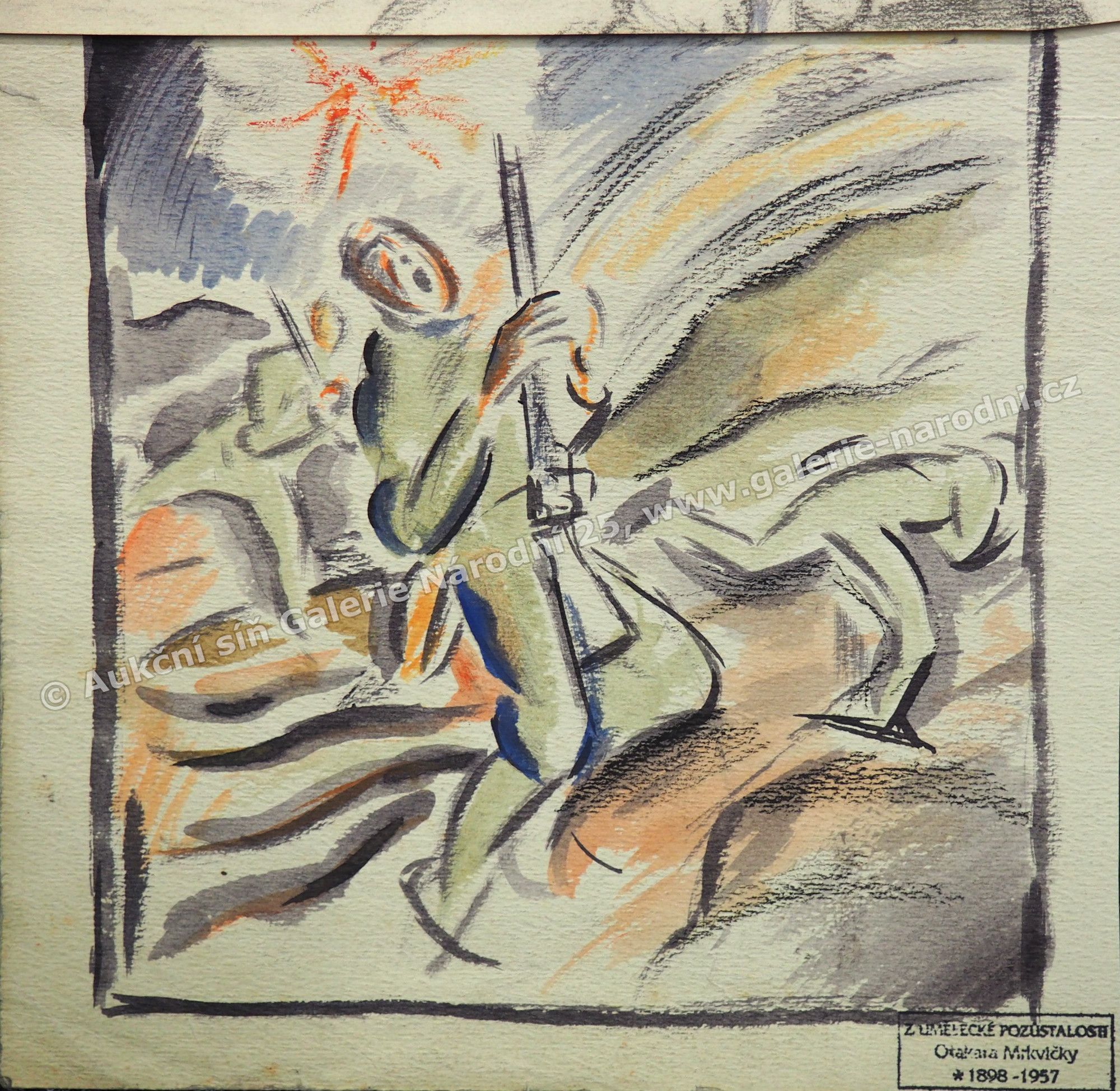 kombinovaná technika na papíře, 19 x 19 cm, volně loženo, papír místy poškozen, přeložka, nesignováno, pozůstalostní razítko autora