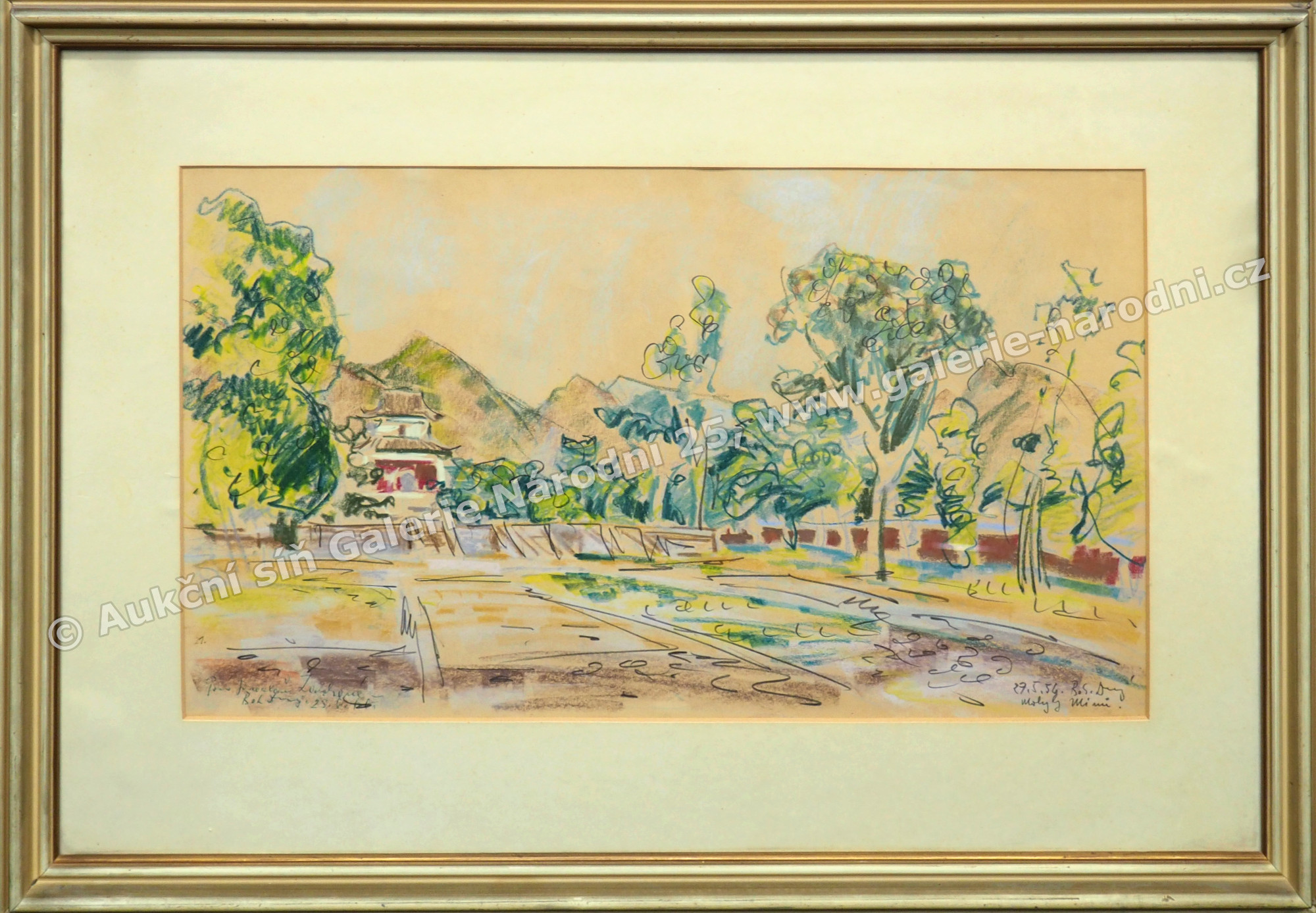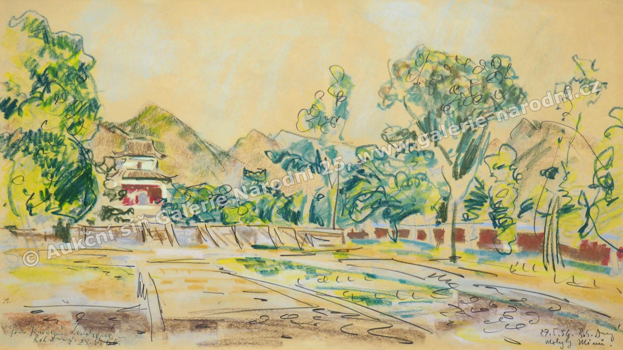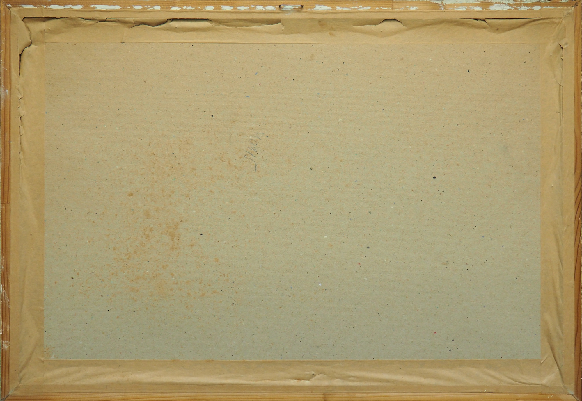 kombinovaná technika na papíře, rozměry ve výřezu pasparty 29 x 51 cm, rámováno, zaskleno, pasparta, rám a malba mírně poškozeny, signováno PD, datováno 1956