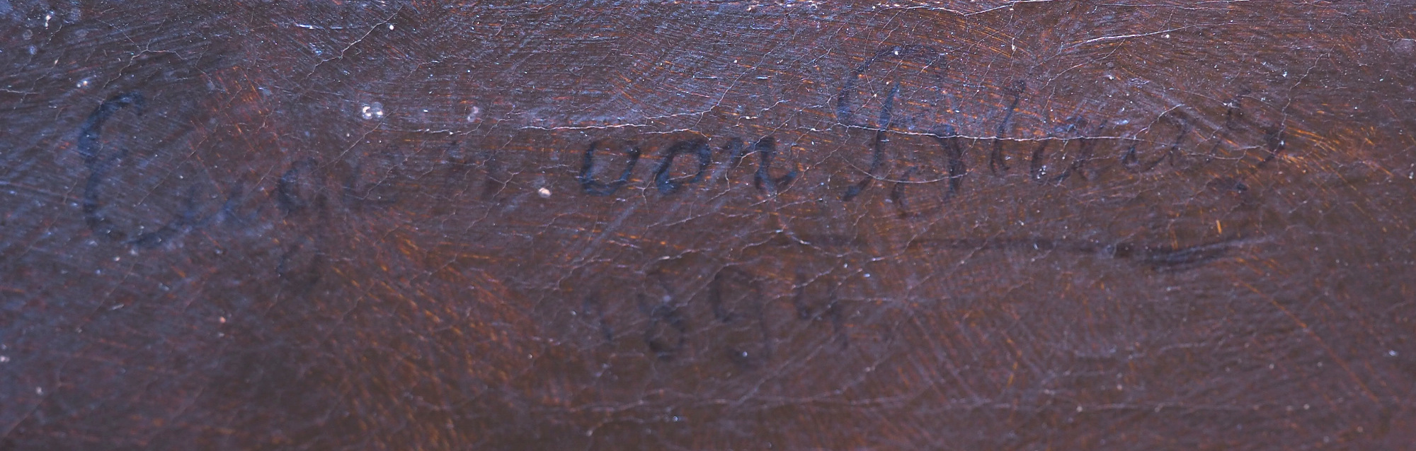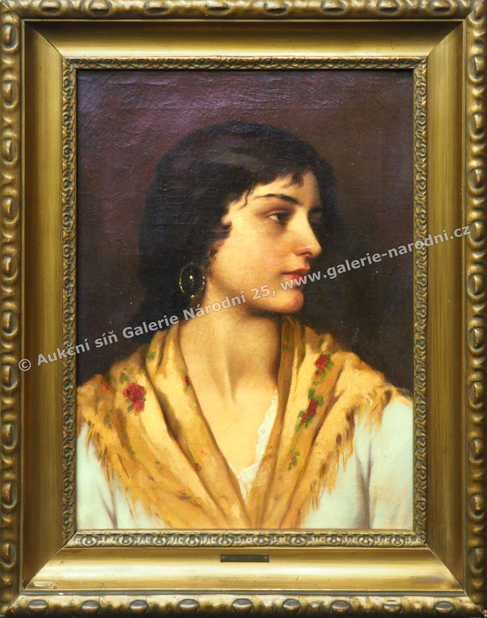 olej na plátně, 53 x 40 cm, rámováno, rám a malba poškozeny, malba silně zkrakelována, obtisknutý vypínací rám v plátně, signováno nečitelně LH
